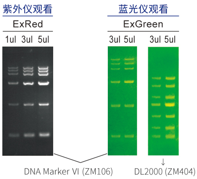 ■ ExGreen核酸電泳染料 (10,000× DMSO溶) ★ 通過以下測(cè)試,均證明無(wú)致癌風(fēng)險(xiǎn) 1.小鼠骨髓微核測(cè)試;2.染色體畸變測(cè)試; 3.艾姆斯測(cè)試;4.乳膠或腈類手套滲透測(cè)試。 ★ 適用于各種大小片段的電泳染色, 條帶整齊性遠(yuǎn)高于普通花菁類染料, 對(duì)核酸遷移的影響較小。 | ![]() |