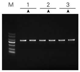 注解:三個月穩(wěn)定性實驗結果圖 柑橘內(nèi)參基因GAPDH 1kb擴增結果 RNA使用量為50 ng 1:4℃保存 2:37℃保存 3:-20℃保存 M:莊盟DL2000(3μl點樣) |