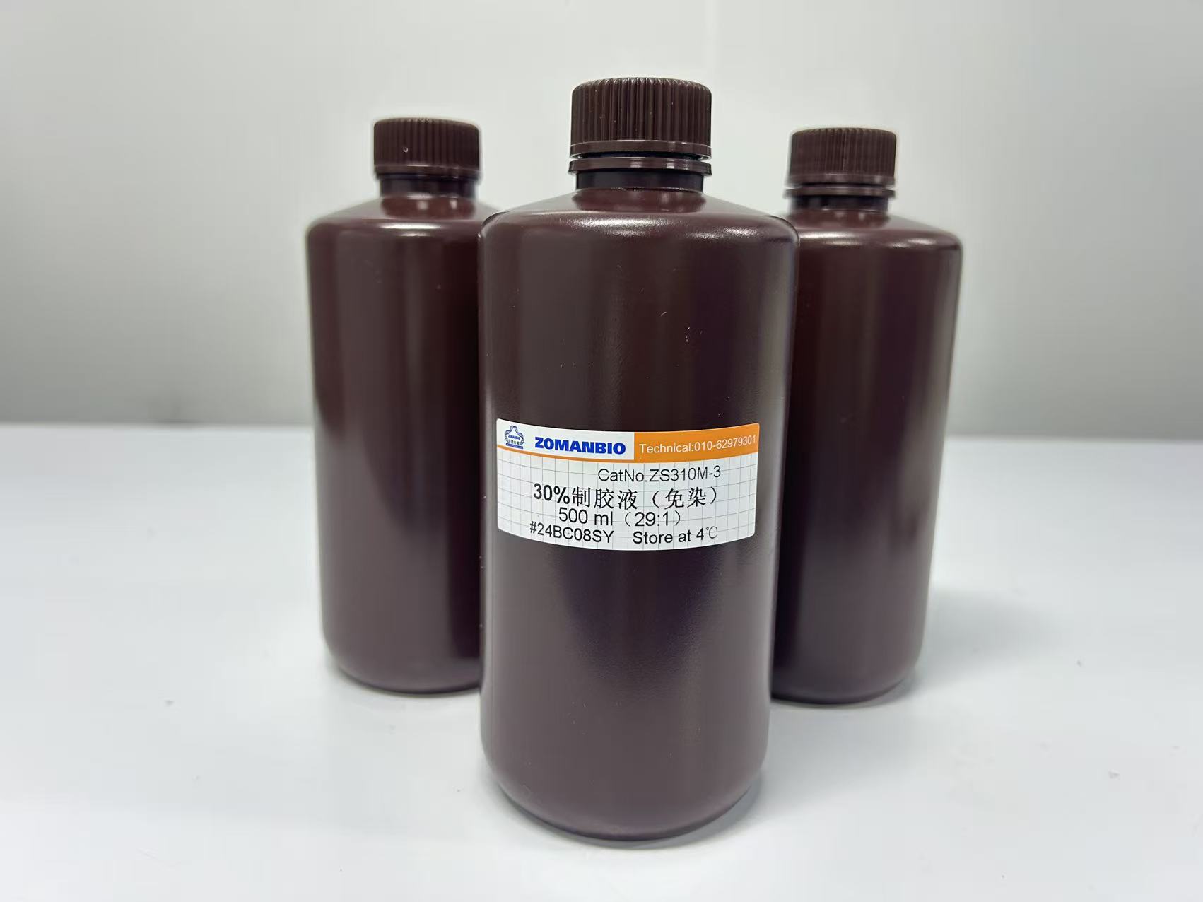30%制膠液(29:1免染)的制膠方法同 普通的30%丙烯酰胺(29:1)制膠液;按比例添加TEMED和 過硫酸銨促凝劑即可。