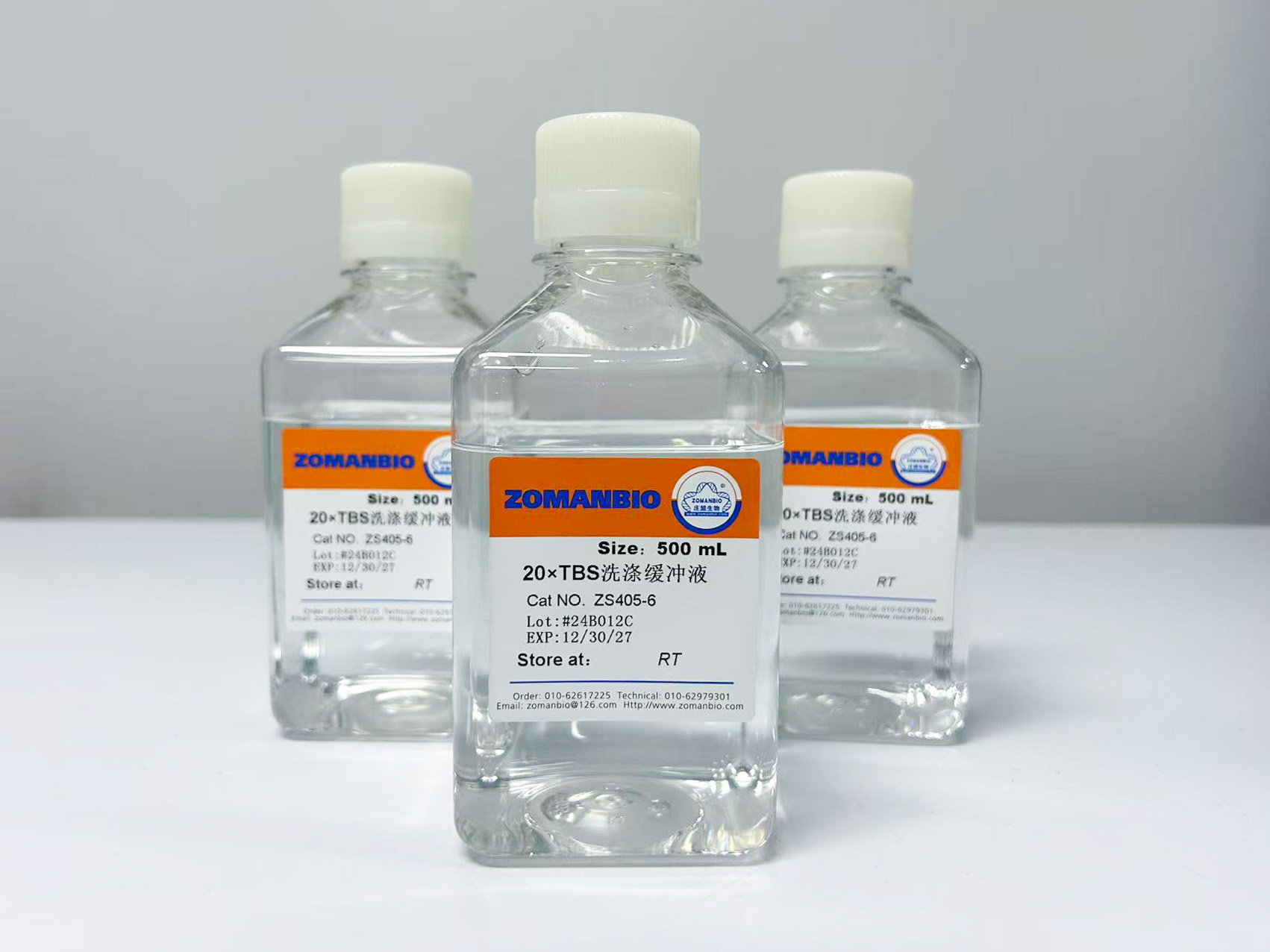 TBS緩沖液是生物學(xué)中常使用的等滲Tris 緩沖鹽溶液,pH=7.6±0.1,主要用于免疫組化和原位雜交,酶聯(lián)免疫等實(shí)驗(yàn)中,清洗免疫印跡實(shí)驗(yàn)中非特異性結(jié)合的抗體等。TBS由Tris-HCl構(gòu)成穩(wěn)定的pH緩沖體系,由NaCl提供等滲條件。