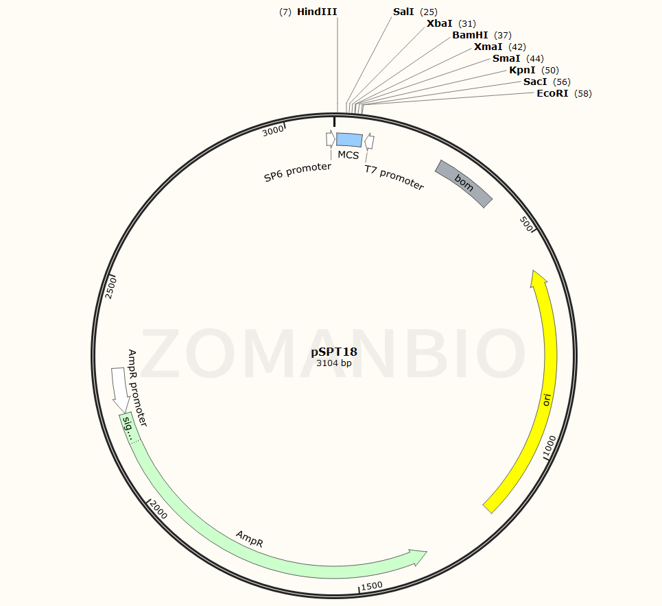 pSPT18是一個(gè)高拷貝質(zhì)粒,質(zhì)粒長度為3104bp,含有Amp青霉素抗性基因,復(fù)制子為pBR322 ori。