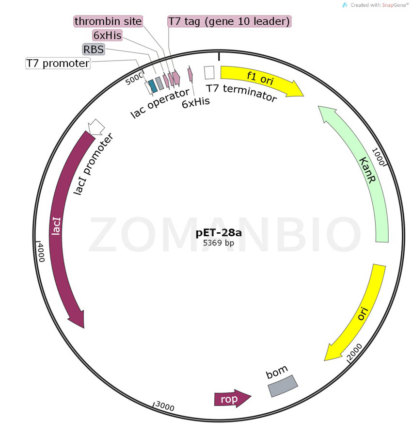 pET-28a質(zhì)粒是一種原核表達(dá)載體,C端含有一個(gè)6×His標(biāo)簽,N端含有6×His標(biāo)簽、thrombin酶切位點(diǎn)、T7標(biāo)簽。該質(zhì)粒含有多個(gè)常用的酶切位點(diǎn),便于不同基因克隆。表達(dá)由宿主細(xì)胞提供的T7 RNA聚合酶誘導(dǎo),目的基因被克隆到質(zhì)粒載體上,受噬菌體強(qiáng)轉(zhuǎn)錄及翻譯信號(hào)控制。pET28a載體的單一的多克隆位點(diǎn)見上面的環(huán)狀質(zhì)粒圖譜。注意:載體序列是以pBR322質(zhì)粒的編碼規(guī)矩進(jìn)行編碼的,所以T7蛋白表達(dá)區(qū)在質(zhì)粒圖譜上面是反向的。T7 RNA聚合酶啟動(dòng)的克隆和表達(dá)區(qū)域在質(zhì)粒圖譜中也被標(biāo)注了出來。質(zhì)粒的F1復(fù)制子是被定向的,所以在T7噬菌體聚合酶的作用下,包含有蛋白編碼序列的病毒粒子能夠產(chǎn)生,并啟動(dòng)蛋白表達(dá),同時(shí)蛋白表達(dá)將被T7終止子序列的作用下終止蛋白翻譯。pET系統(tǒng)是有史以來在大腸桿菌中表達(dá)重組蛋白的功能最強(qiáng)大的系統(tǒng),也是現(xiàn)今原核表達(dá)方面使用最廣泛的系統(tǒng)。該系列質(zhì)粒能很容易的通過降低誘導(dǎo)物的濃度來削弱蛋白表達(dá)。在非誘導(dǎo)條件下,可以使目的基因處于完全沉默狀態(tài)而不轉(zhuǎn)錄。 質(zhì)粒只保證關(guān)鍵序列正確,不保證表達(dá)效果。