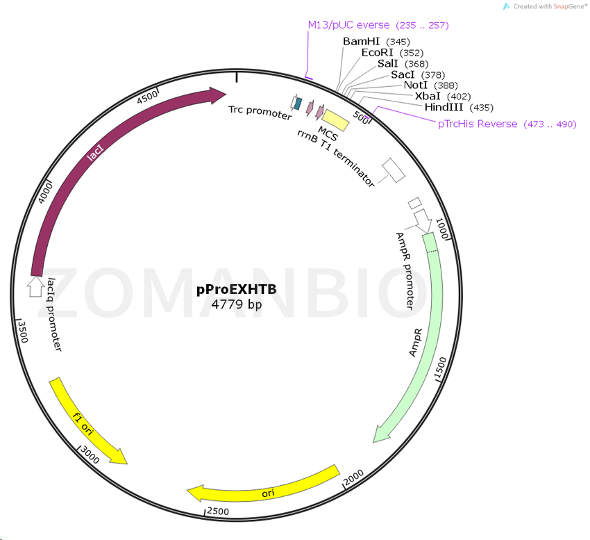 pProEXHTB質(zhì)粒是一種原核表達載體, N端含有一個6×His標簽和一個TEV位點。該質(zhì)粒含有多個常用的酶切位點,便于不同基因克隆。