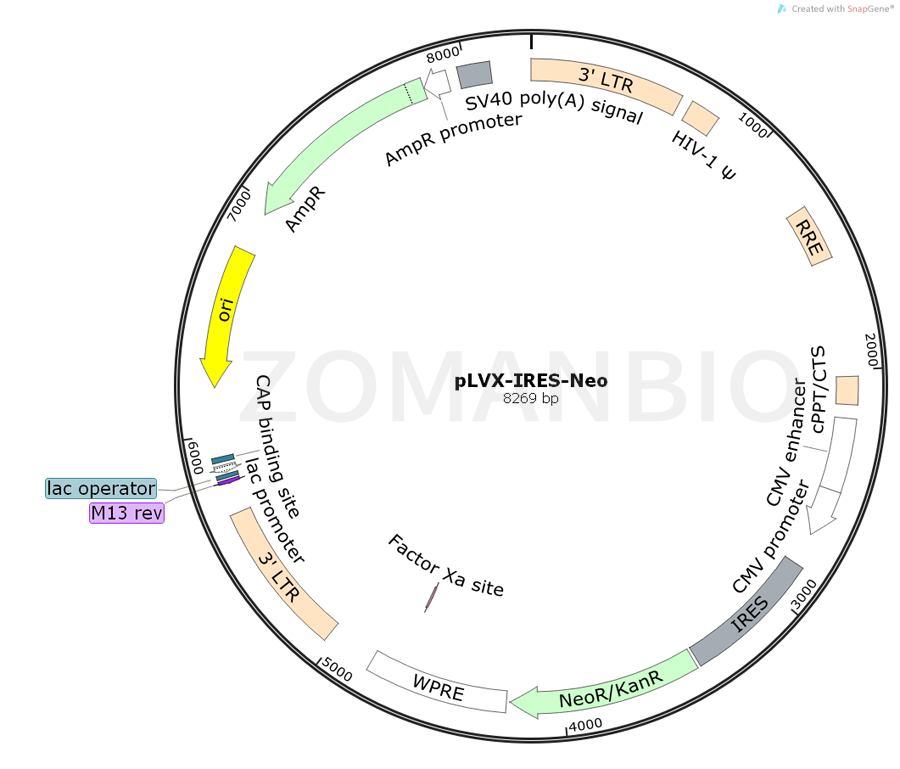 pLVX-IRES-Neo is an HIV-1-based, lentiviral expression vector that allows the simultaneous expression of your protein of interest and G418 resistance (Neor) in virtually any mammalian cell type, including primary cells. The vector expresses your protein of interest and Neor from a bicistronic mRNA transcript, allowing G418 resistance to be used as an indicator of transduction efficiency and a marker for selection.