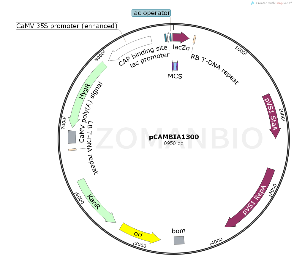 The pCambia vector backbone is derived from the pPZP vectors. The pCambia1300 vector offers:1.high copy number in E.coli for high DNA yields2.pVS1 replicon for high stability in Agrobacterium 3.small siz 4.restriction sites for modular plasmid modifications and small but adequate polylinkers for introducing DNA of interest 5.bacterial selection with kanamycin 6. plant selection with hygromycin B.