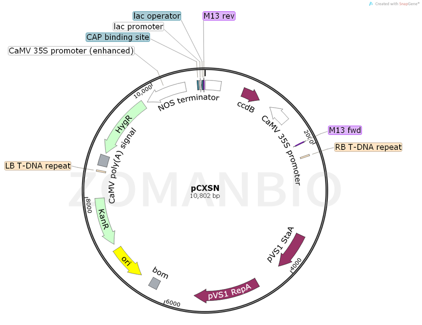 pCXSN質(zhì)粒是一個植物過表達載體,用Xcm I 酶切后變成T載體,連入基因后可直接轉(zhuǎn)化。其參考文獻是A versatile zero background T-vector system for gene cloning and functional genomics.