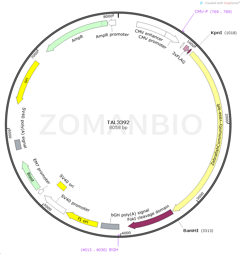 TAL3392質(zhì)粒是一個(gè)CMV啟動(dòng)表達(dá)斑馬魚的 ZebrafishCommunity-vasa-left 基因的真核表達(dá)質(zhì)粒。