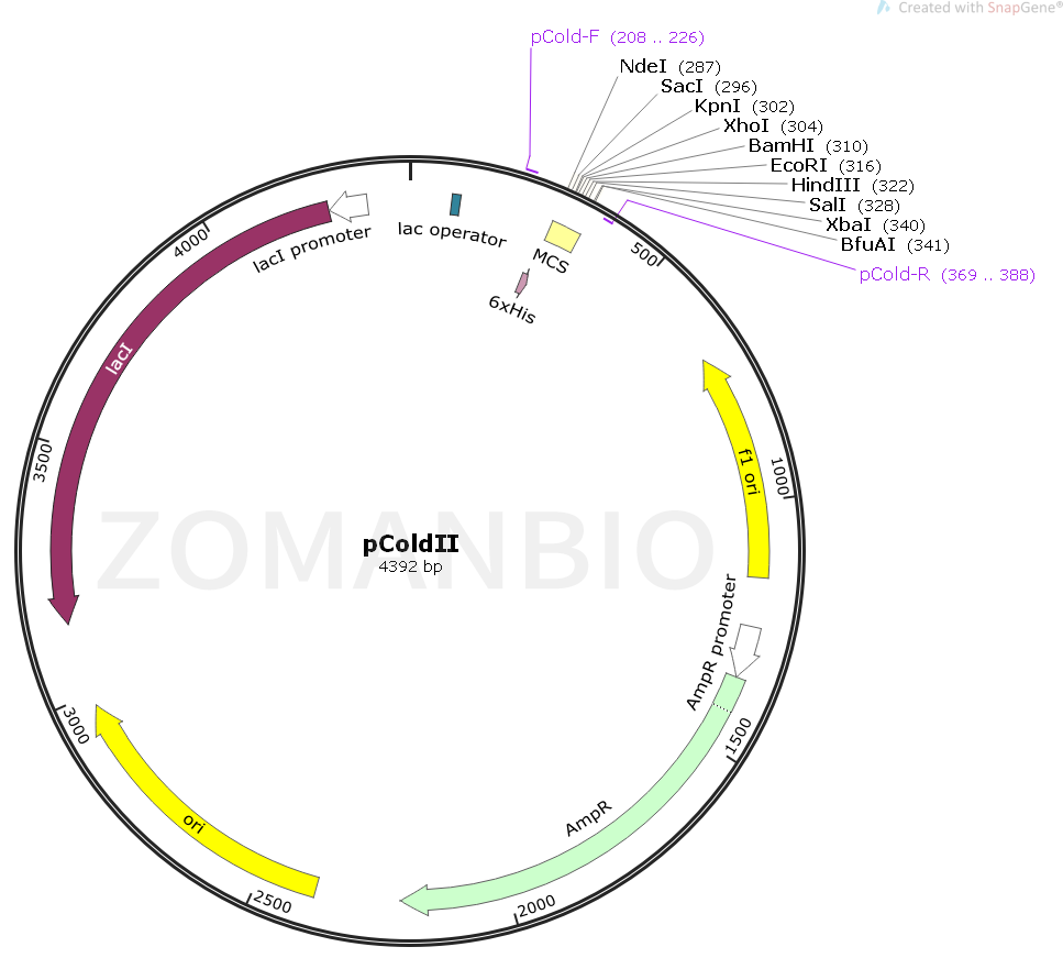 pColdII質(zhì)粒是利用冷休克基因CSPA啟動(dòng)子設(shè)計(jì)高效率蛋白質(zhì)表達(dá)載體。在E.COLI啟動(dòng)子下游處,插入了lac操縱子,以便嚴(yán)格控制表達(dá)。此外,5’非翻譯區(qū)(5’UTR),翻譯增強(qiáng)元件(TEE),His標(biāo)簽序列,Xa因子切割位點(diǎn)和多克隆位點(diǎn)(MCS)位于CAPS啟動(dòng)子的下游。當(dāng)培養(yǎng)溫度切換到低溫時(shí),大腸桿菌暫時(shí)停止生長,大部分的大腸桿菌蛋白質(zhì)表達(dá)減少,但是一類稱為冷休克蛋白的蛋白質(zhì)被特異性誘導(dǎo)表達(dá)。