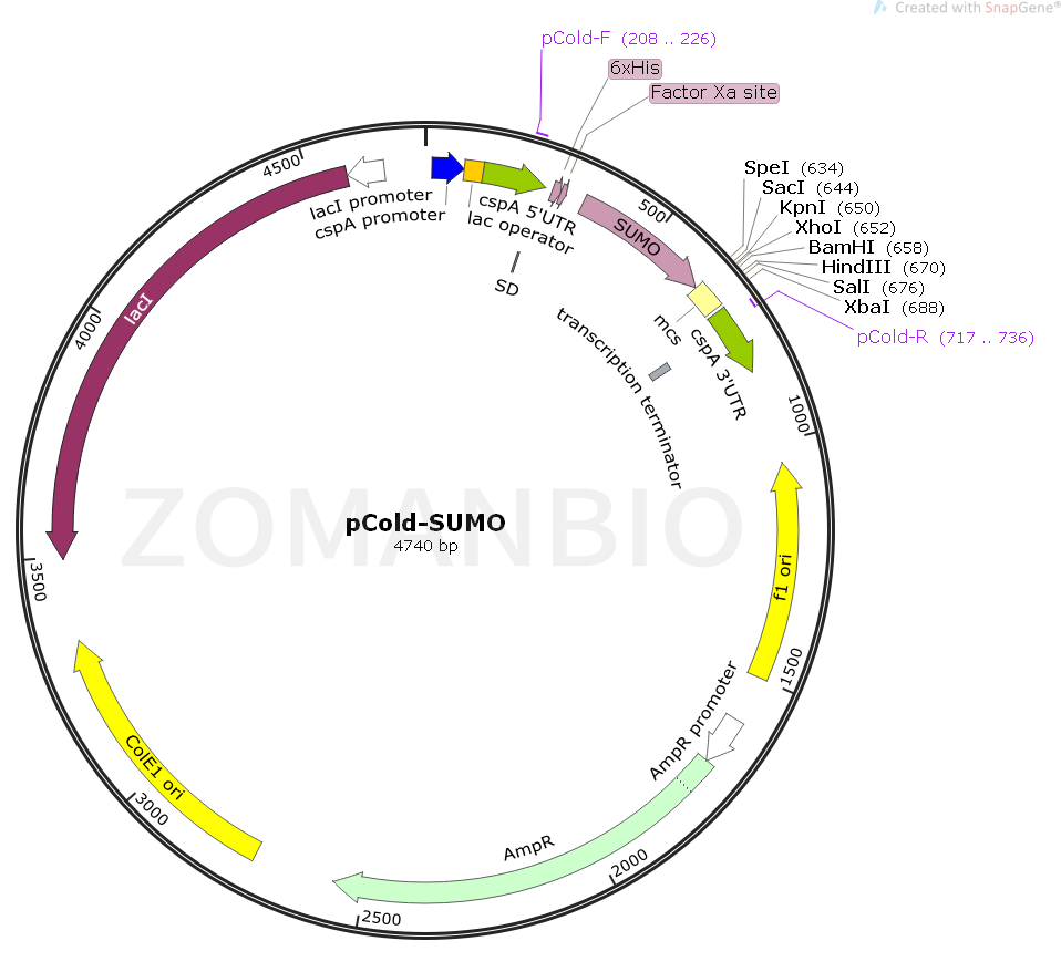 pCold-SUMO質(zhì)粒是利用冷休克基因CSPA啟動子設(shè)計(jì)高效率蛋白質(zhì)表達(dá)載體。在E.COLI啟動子下游處,插入了lac操縱子,以便嚴(yán)格控制表達(dá)。此外,5’非翻譯區(qū)(5’UTR),翻譯增強(qiáng)元件(TEE),His標(biāo)簽序列,Xa因子切割位點(diǎn)和多克隆位點(diǎn)(MCS)位于CAPS啟動子的下游。當(dāng)培養(yǎng)溫度切換到低溫時(shí),大腸桿菌暫時(shí)停止生長,大部分的大腸桿菌蛋白質(zhì)表達(dá)減少,但是一類稱為冷休克蛋白的蛋白質(zhì)被特異性誘導(dǎo)表達(dá)。