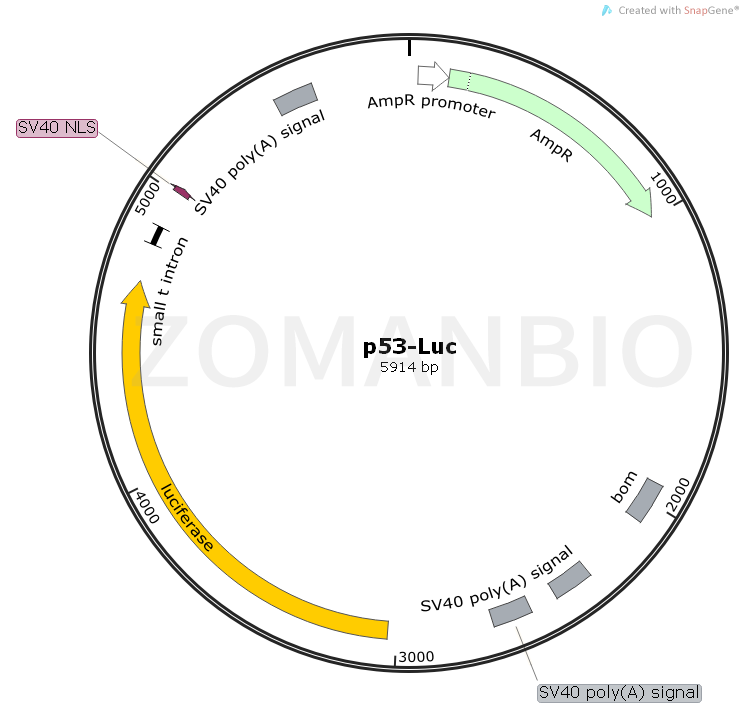p53-Luc是一個(gè)哺乳細(xì)胞單熒光素信號(hào)通路報(bào)告質(zhì)粒。
