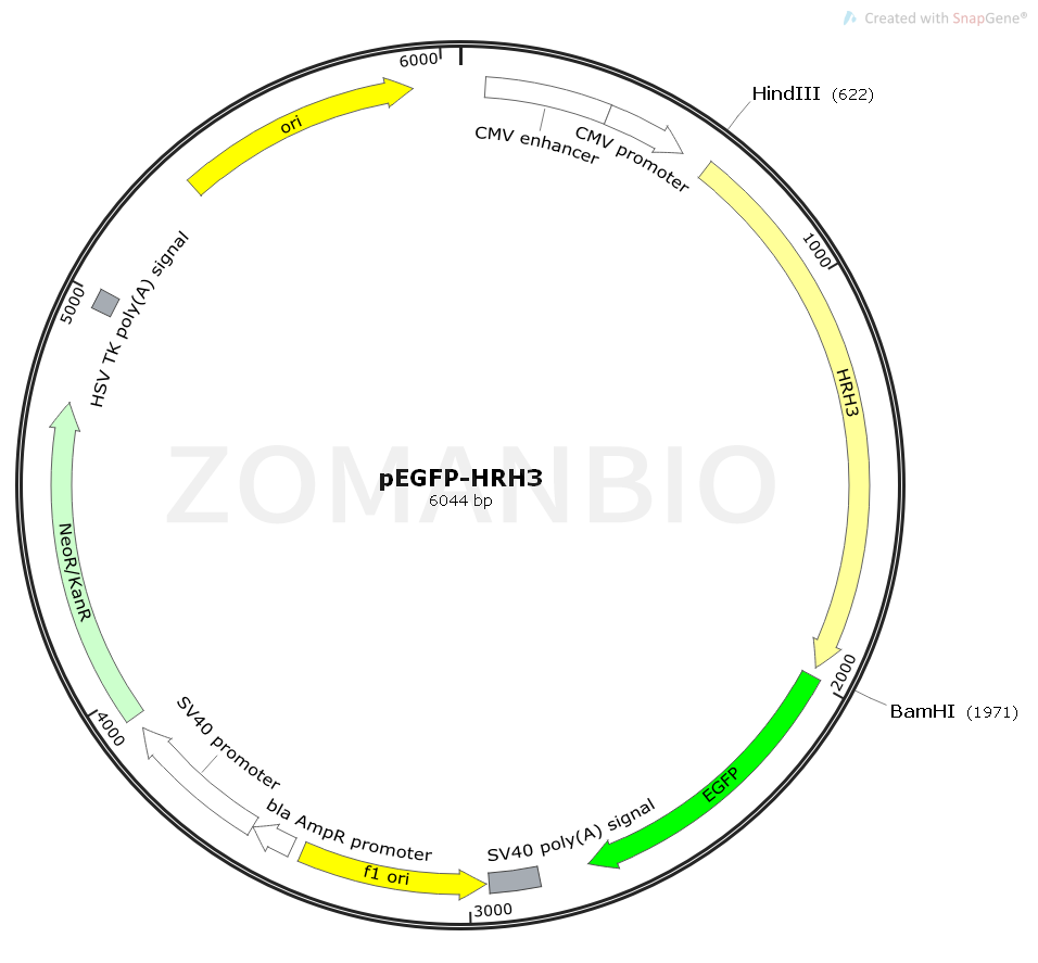 pEGFP-HRH3質(zhì)粒是一個(gè)哺乳細(xì)胞過表達(dá)質(zhì)粒,CMV啟動(dòng)子驅(qū)動(dòng)HRH3人源基因和EGFP綠色熒光蛋白融合表達(dá)。
