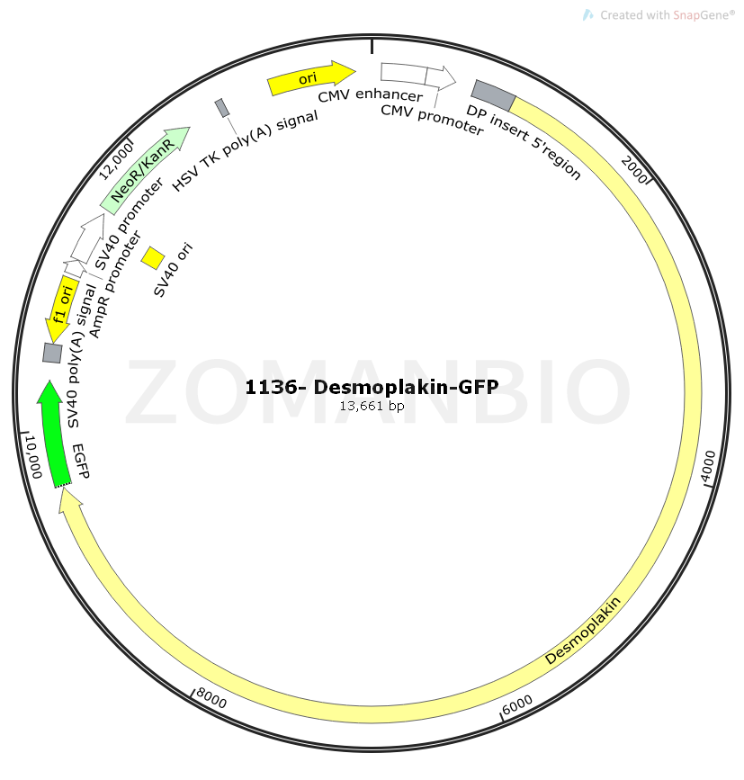 1136- Desmoplakin-GFP質(zhì)粒是一個(gè)哺乳細(xì)胞過表達(dá)質(zhì)粒,CMV啟動(dòng)子驅(qū)動(dòng)Desmoplakin人源基因和EGFP綠色熒光蛋白融合表達(dá)。該質(zhì)粒的參考文獻(xiàn)是:Desmoplakin assembly dynamics in four dimensions: multiple phases differentially regulated by intermediate filaments and actin.