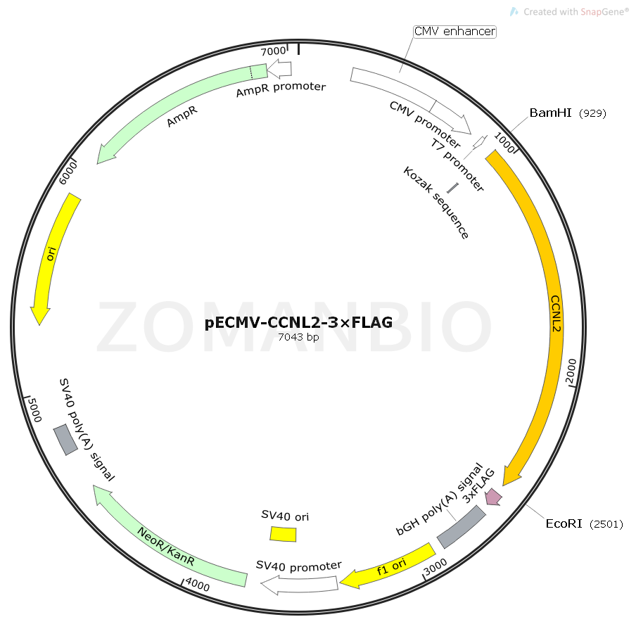 pECMV-CCNL2-3×FLAG質(zhì)粒是一個哺乳細(xì)胞過表達(dá)質(zhì)粒,CMV啟動子驅(qū)動CCNL2人源基因和3×FLAG標(biāo)簽融合表達(dá)。